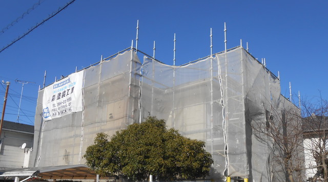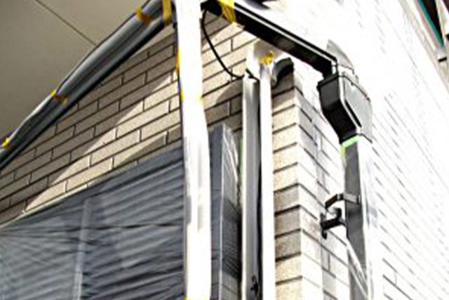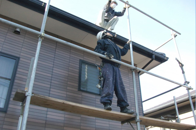 事前に近隣へのご挨拶の後安全を確保するために足場を組み立て、塗装前の準備を行います。