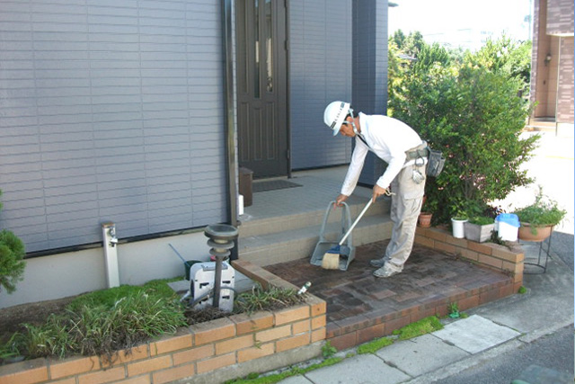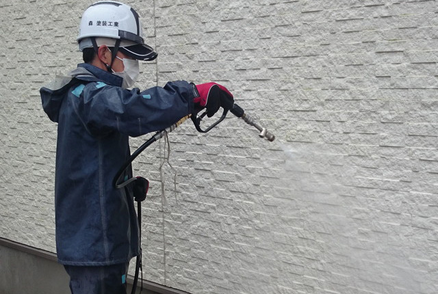 汚れ、コケ、ホコリをきれいに流して下地を整えます。