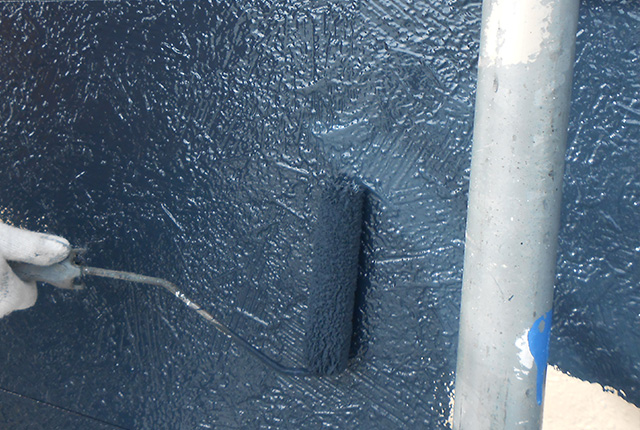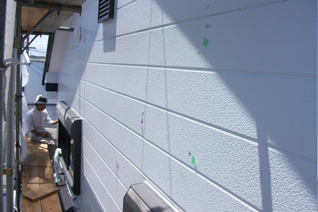 工法や塗料にもよりますが上塗りと同じもの、 もしくは中塗り専用塗料(仕上げより若干薄めの色)を塗っていきます。
