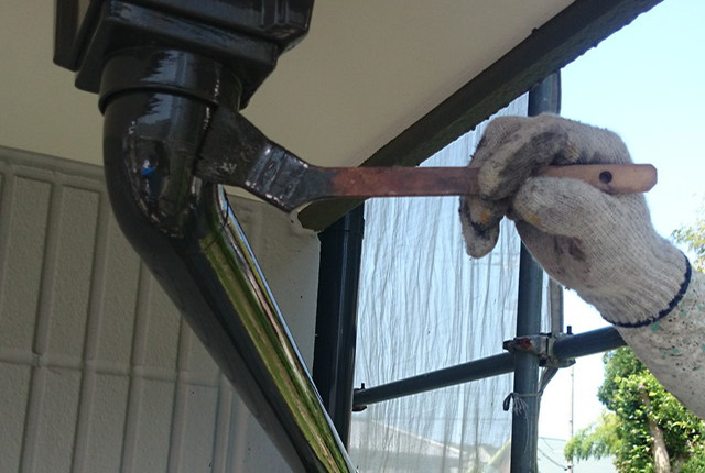 雨どい、トタン、破風板、軒天井など打ち合わせ通りに付帯物を塗装していきます。